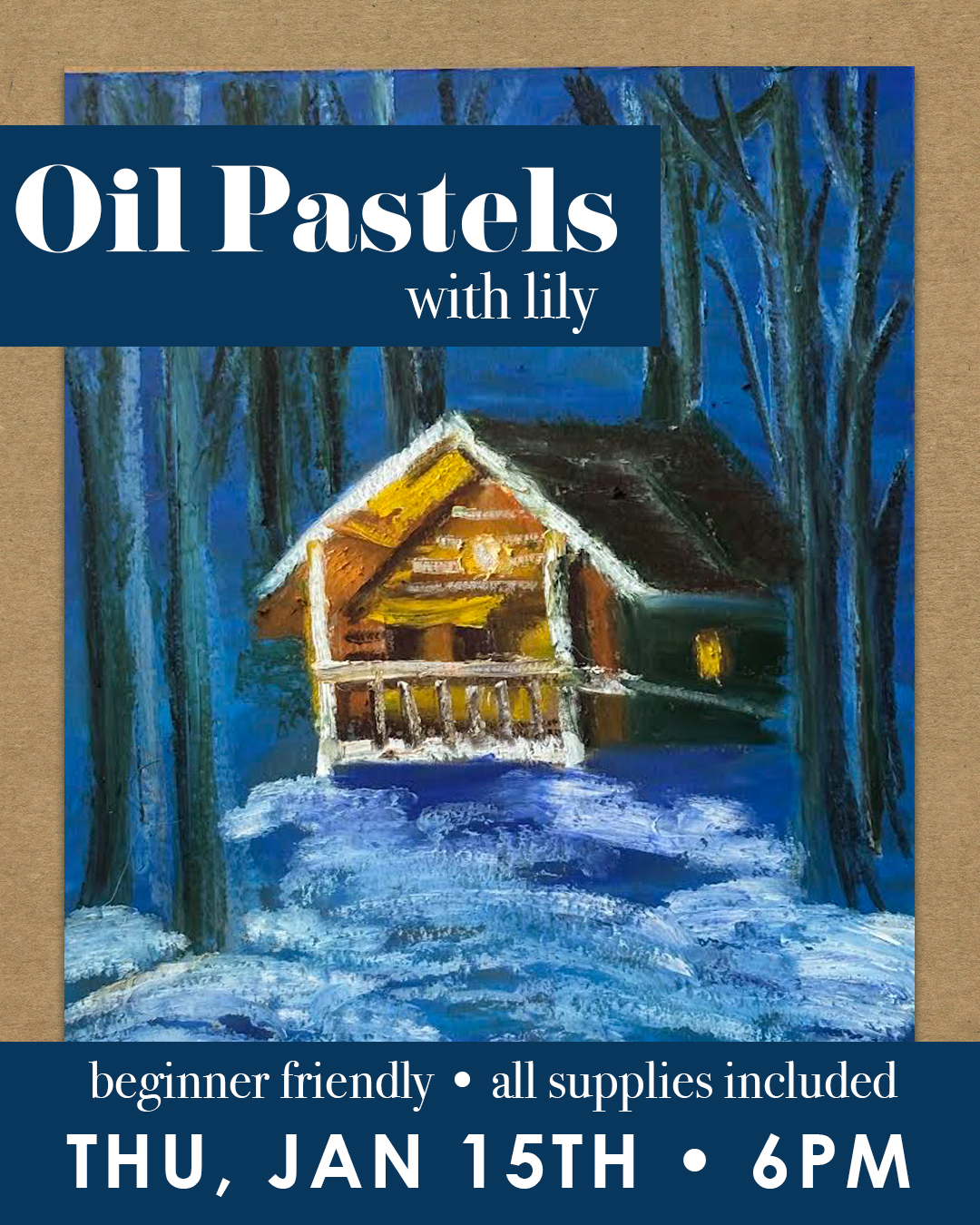 Dive into the magic of oil pastels as you create a cozy cabin scene! In this beginner-friendly class, Lily will show you how to blend rich colors, build expressive textures, and bring snowy evergreens to life while filling the cabin with warmth. You’ll explore fun techniques to make your piece feel full of depth and movement.