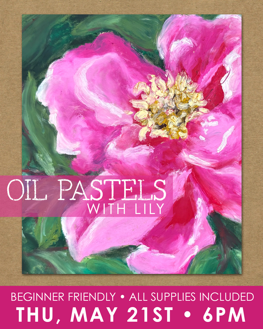 Dive into the magic of oil pastels as you create a beautiful peony! In this beginner-friendly class, Lily will show you how to blend rich colors, build expressive textures, and create a full bloomed peony. You’ll explore fun techniques to make your piece feel full of depth and cuteness.